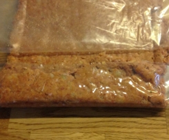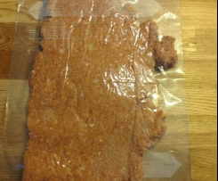 Die Hackmasse zwischen zwei aufgeschnittenen Gefrierbeuteln zu einem Rechteck ausrollen.