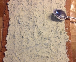 Die obere Folie entfernen und die Frischkäsemischung auf dem Hackfleischrechteck verteilen. Dabei einen Rand von ca. 1 cm frei lassen.