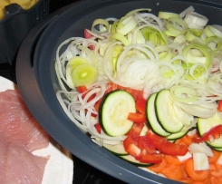 Nun gebe ich das Gemüse schichtweise in den Varoma: Karotten, Sellerie, Paprika, Zuccini, Zwiebeln, Lauch. Mit Salz und Pfeffer etwas würzen.