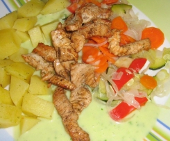 In der Zwischenzeit die Putenschnitzel in 1 cm dünne Streifen schneiden und in einer Pfanne mit etwas Oel heiß anbraten, das sie schön knusprig werden. Danach mit Salz und Pfefer würzen.
