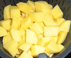 Kartoffeln in 1 cm große Würfel schneiden und in den Gareinsatz geben, etwas salzen.
