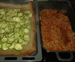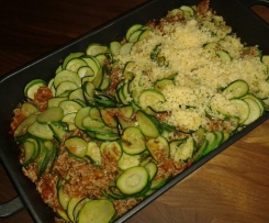 Geriebenen Käse darüberstreuen, in den Backofen stellen und bei 200° ca. 25 Minuten backen.