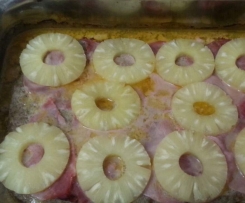 In eine beschichtete Auflaufform den Fleischteig streichen mit Schicken und Ananasscheiben belegen.