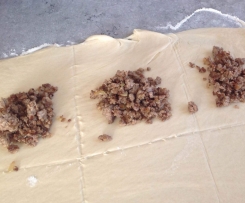 Den Teig auf eine bemehlte Arbeitsfläche zu einem Rechteck ausrollen Taschen abstecken, mit Hackfleisch belegen und zusammenklappen. Eigelb mit Öl mischen und die Taschen damit bestreichen.