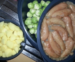 Habe Hähnchenbrustfilet genommen und in Streifen geschnitten, Kartoffeln in kl. Stücken , nach 35 min war alles gar. Die Soße muss gut gewürzt werden.