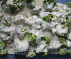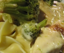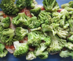 Ich bereite es z. B. morgens vor und stelle es abends für ca. 50 Minuten in den Herd (180 °C O-/U-Hitze ohne vorzuheizen) Dabei zwischendurch abdecken, damit der Brokkoli nicht schwarz wird. So eignet sich das Gericht auch für Feiern und man muss nur noch die Nudeln (oder Reis, Kartoffeln) kochen.
