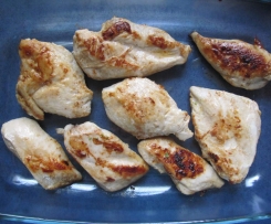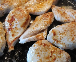 In der Zwischenzeit die Hähnchenbrustfilets in einer Pfanne gar braten und mit Salz, Pfeffer und Paprika würzen.