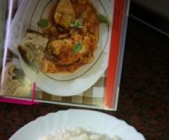 "Sanftrührstufe" garen.Während der Garzeit das Hänchen in Schenkel, Flügel und Brust zerteilen.3.Hänchenstücke, Wasser, Tomatensauce, Brühwürfel, Salz und Pfeffer zugeben und 20Min./Varoma/St.