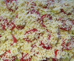 Den Rest Nudeln, Porree und Tomaten einschichten und die Eiermilch darüber gießen.