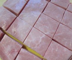 Die Kochschinken-Scheiben in große Stücke und die Tomaten in Scheiben schneiden.