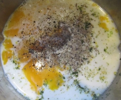 Den Gareinsatz mit dem Porree entnehmen. Das Wasser entfernen und Eier, Milch und Gewürze hineingeben ....