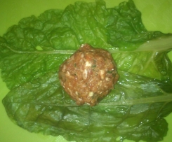 Ein großes und kleines Mangoldblatt versetzt aufeinander legen und in die Mitte ein Hackfleichbällchen legen. Mangold um das Hackfleischbällchen wickeln und mit der offenen Seite nach unten in eine feuerfeste Auflaufform geben.