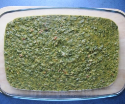 Diese Spinat-Tomatenmasse in eine Auflaufform füllen. Meine ist 23 x 34 cm groß.