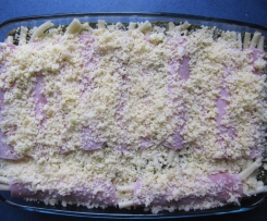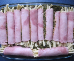 Diese Nudel-Schinken-Rollen in das Spinatbett legen ....