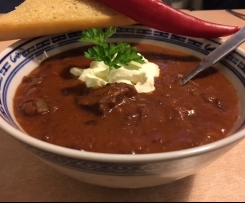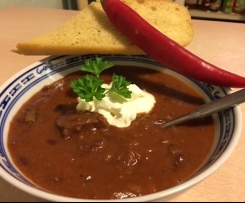 Schmeckt sehr gut, leider sind die Bohnen vollständig zerkocht. 1,5 Tl Chilipulver reichen völlig. Man kann ja hinterher noch nachwürzen, wer es noch schärfer mag.