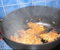 .......und das Gemüse aus dem Mixer mit etwas Butter im Bräter andünsten. Und nach 2-3 Minuten Dosentomaten dazugeben mit Thymian, Oregano und der Petersilie. Mit der Gewürzmischung würzen.