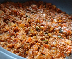 5. Restlichen Zwiebelmix mit Butter in einer Pfanne kurz andünsten, Hackfleisch dazugeben und krümelis anbraten.