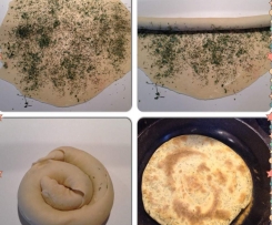 6. in der Zwischenzeit den restlichen Teig zu einer Kugel formen und ausrollen. Mit Butter bestreichen und ein paar trockenen oder frischen Kräutern bestreuen.