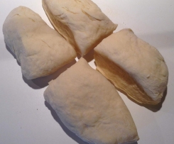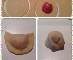 3. nehmen sie eins der vier Teile, und rollen es mit dem Nudelholz aus. Ab und zu wenden und drauf achten das der Teig nicht an der Arbeitsfläche klebt. Drücken sie nun mit dem Messbecher kreise aus und legen ein Hackbällchen hinein. Siehe Foto.