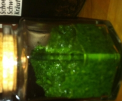 Hergestellt aus ca. 800g gemischten frischen Kräutern. Liebstöckel, Petersilie, Schnittlauch, Knoblauch, 100g Meersalz.