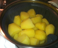 "Mixtopf geschlossen" ab. Geben dort die 2 TL Brühe hinein.Nun das Garkörbchen einhängen und die vorher geschälten Kartoffeln (500g abwiegen) zugeben.