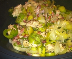 So sieht das fertig gegarte Fleisch mit dem Porree aus, noch ohne Soße