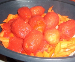 Dann die Dose Tomaten darüber verteilen und ( in Stücken ) mit Gemüsebrühe und Pfeffer würzen .