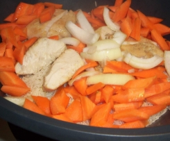 Dann die 2 Möhren in dünne Scheiben über dem Fleisch verteilen ..
