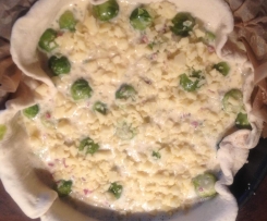 Rosenkohl auf dem Teig in der Springform verteilen, die Schmandmischung daraufgeben, mit Käse bestreuen, überstehende Ränder nach innen klappen und 30-35 Minuten 200°C backen.
