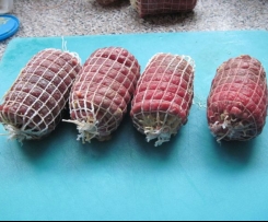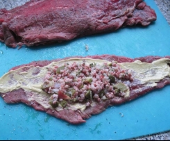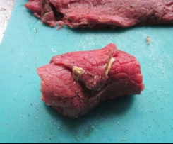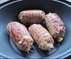 In der Zwischenzeit die Rouladen etwas klopfen, salzen und pfeffern und mit jeweils 1 TL Senf einstreichen. Von der Füllung 2 EL auf jede Roulade geben und einrollen. Mit Bindfaden zubinden (ich nehme dazu immer den R....fix, weil die Rouladen dann in ein Netz eingewickelt sind und weil es schnell geht).