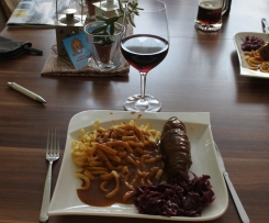 Anschließend gebe ich die Sauce noch in den Bräter und lasse die Rouladen noch zugedeckt 5-10 Minuten ziehen. - Bei uns gab es dazu Spätzle und Blaukraut und ein gutes Gläschen Rotwein.
