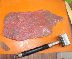 Das Fleisch wie es von daheim kenne mit Folie über dem Fleisch mit der glatten Seite geklopft.