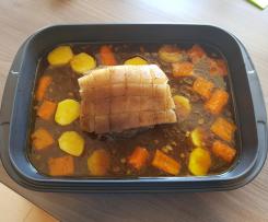 - Fleisch mit der Schwarte nach oben, Gemüse aus dem Varoma und Garsud aus dem Mixtopf (HINWEIS: Flüssigkeit nicht über die Schwarte schütten, sonst wird sie nicht knusprig) in eine feuerfeste Form geben und in den vorgeheizten Ofen schieben, bis die Schwarte schön knusprig ist.