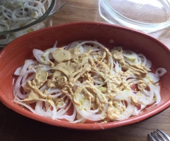 - Zwiebeln schälen & in Ringe schneiden. Anschließend mit Senf bestreichen