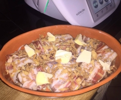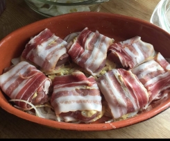 - Schweinefilet in ca 12 Medallions schneiden, würzen, mit Senf bestreichen und anschließend mit Bacon umwicklen und auf die Zwiebeln legen.