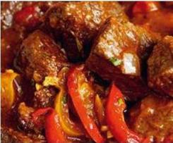 - 600 g Rindersteak, in 2-3 cm Würfel geschnitten
