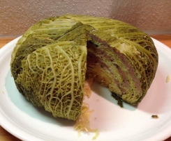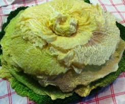 1. Wirsing aus dem Handtuch auf einen Teller stürzen und in 'Kuchen-Stücke schneiden