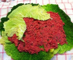 Auf dem Tuch mittig in ca. 4 Schichten Wirsingblätter und Hackteig abwechselnd auslegen.