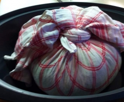 Das Tuch von den 4 Ecken aus zusammenziehen und vorsichtig den Inhalt zu einer Kugel formen. Mit einem Zipfel kann man es oben zusammenbinden.