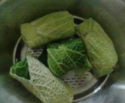 Das kochende Wasser in eine Schüssel geben und die Blätter darin ca 4 Minuten einweichen, dann lassen sich die Rouladen viel leichter wickeln.