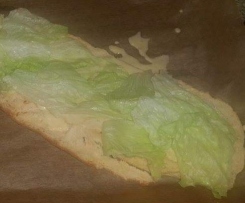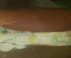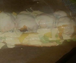8. Das Brötchen der Länge nach durchschneiden und mit KäseSauce und Salat belegen.