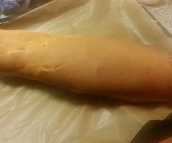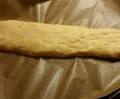 Mit dem Spatel aus dem Mixtopf geschlossen"Mixtopf geschlossen" holen und zu einer langen dicken Wurst kneten/ formen. Auf ein Backblech geben, sodass es Diagonal genau darauf passt und 40 Minuten zugedeckt gehen lassen. Danach für 13 Minuten auf 200 Grad backen.