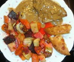 Putenschnitzel hier mit gebackenem Herbstgemüse und Kräuterbaguette.