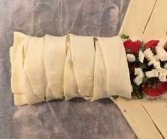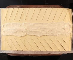 Wir nehmen ganz einfach eine Blätterteigrolle (ausgerollt), belegen den mittleren Streifen und klappen alle Enden zusammen. Geht super easy, klappt und schaut auch schön aus.
