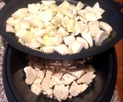 Den Blumenkohl in kleine Stücke schneiden und in den Varoma legen. Den Fenchel halbrieren und Strunk entfernen. Auch diesen in Stück schneiden und in den Varoma Einlegeboden legen. Beides Salzen und Pfeffern und mit etwas Zitronensaft beträufeln.