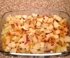 In die Auflaufform die Fussili und Schinkenwürfel geben. Wenn der Blumenkohl und der Fenchel fertig ist mit dazu geben und vermischen. Die Garflüssigkeit auffangen und beiseite stellen.