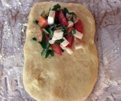 Da mein Mann keinen geschmolzenen Käse mag habe ich eine Hälfte der Taschen mit gedünsteten Zuchini, Paprika und Schalottenwürfelchen gefüllt, die änder Hälfte für mich mit Tomate, Mozzarella und Basilikum.