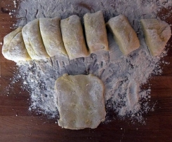 Den fertigen Teig aus dem Mixtopf nehmen, in 8 gleichgrosse Teile schneiden und aus jedem Teil eine Rechteck formen (einfach mit den Fingern zurechtdrücken, nicht zu dünn, ca 5mm dick)
