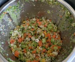 600 g Wasser, 2 EL Brühe hinzugeben und das Ganze einmal mit dem Spatel umrühren, 15 Min./100°C/Stufe 1,5 kochen.
