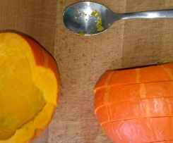 2. Den Kürbis mit einem gezacktem Messer (z.B. Brotmesser) zerteilen und die beiden Hälften mit einem Esslöffel von den Kernen befreien. Beim Schneiden aufpassen, man rutscht schnell ab.